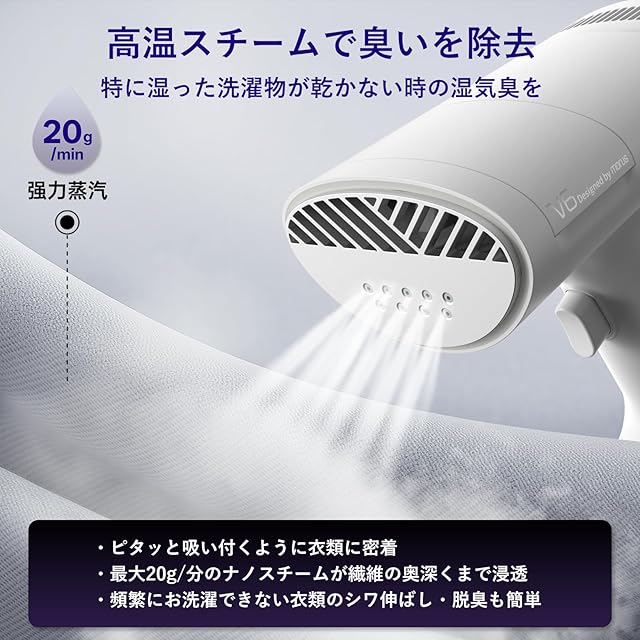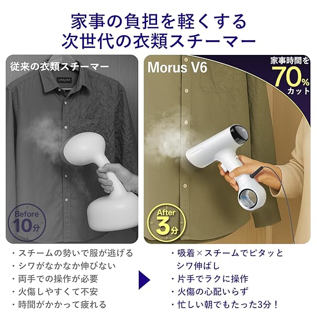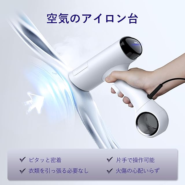 【片手で操作】アイロンがけの際、従来の衣類スチーマーのように衣類を引っ張る必要がないため、片手で操作可能で、火傷しにくい。