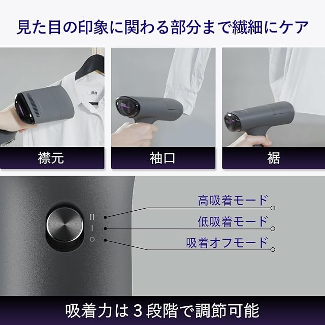【吸着力は3段階】吸着力は、「強・弱・OFF」の3段階。デニム・コートなどの厚手の生地は「強」、綿・麻などの一般的な薄手の生地は「弱」、フリル、プリーツが入った部分は「OFF」といった具合に、素材に合わせて調節可能。