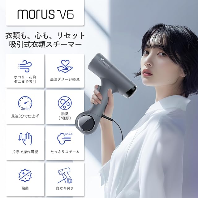 Morus V6 衣類スチーマー スチームアイロン 真空吸着式 3000Pa強力吸引 片手操作 3段吸着力調整 脱臭・除菌・花粉低減 急速クールダウン 170ml PSE認証済 家庭用 外出前速攻ケア コンパクト設計 旅行出張用 プレスもできる2WAY(ダークグレー)