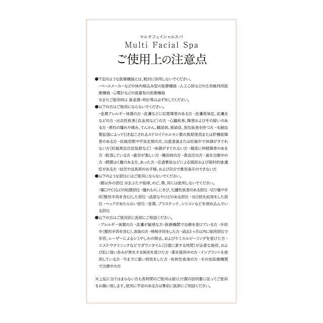 美顔器の単品購入にはガイドブックはついておりません。 emsが弱いと感じられる場合は、保護フィルムを剥がしているか確認して下さい。剥がしている場合は、すぐに感謝状に記載のBeautickサポートまでご連絡下さい。 充電に関しては、必ず、付属のケーブルの使用と充電器の出力にお気をつけ下さい。定格電源:DC-5V 海外でのご使用は交流100~220Vの範囲内でご使用下さい。の対象は、日本国内での使用に限ります。