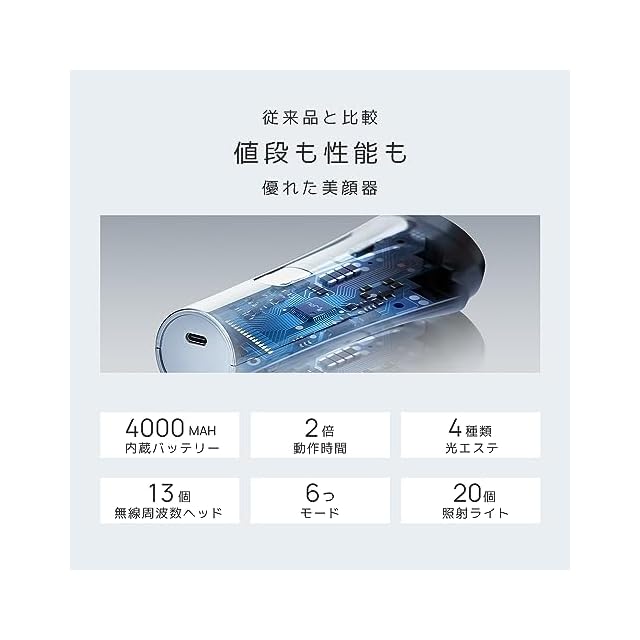 【USB充電・お持ち便利】本製品に付属のUSBケーブルを使って、USB用ACアダプターに接続すれば、場所を取らずどこでも充電ができます。また、4000mAh大容量バッテリー付き、満充電の状態で、約10時間ご利用いただけます。外出先でもすぐに電池切れを心配することなく持ち運べます。製品の重量はわずか約246.6gとコンパクトで、持ち運びやすく、お宅だけでなく、旅行先や出張先、更に海外でも手軽にスキンケアできます。