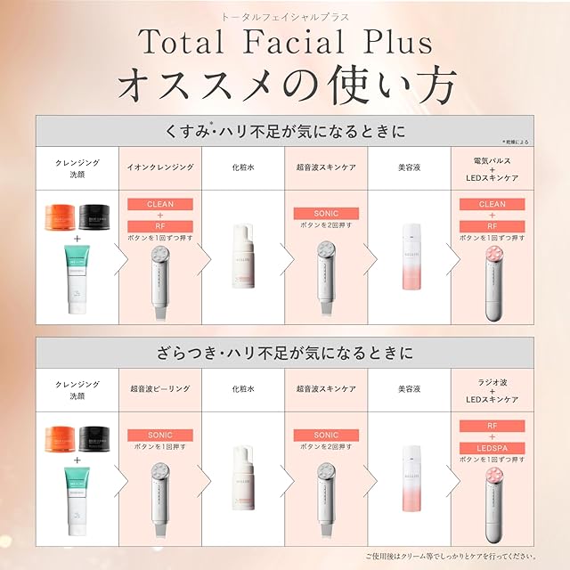 ✅【イオンクレンジング】イオン機能の洗顔で取れない頑固な汚れを取り除くことが期待できます。推奨頻度:週に2~3回、1日1回まで ※ピーリングケアと日を分けてご使用いただくことをおすすめします。✅【モイスチャー】肌に美容液を塗り、超音波振動で優しくタッピングすることで、うるおいの浸透*を高めます。※角質層まで。推奨頻度:1日1回
