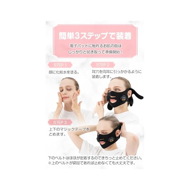 【3ステップの簡単装着】顔に化粧水を塗って、耳穴に両耳に引っ掛け上下のマジックテープを止めるだけ! ※フェイスベルトの裏のゴムの部分(電子パッド)に直接化粧水を塗らないでください。故障の原因になります。
