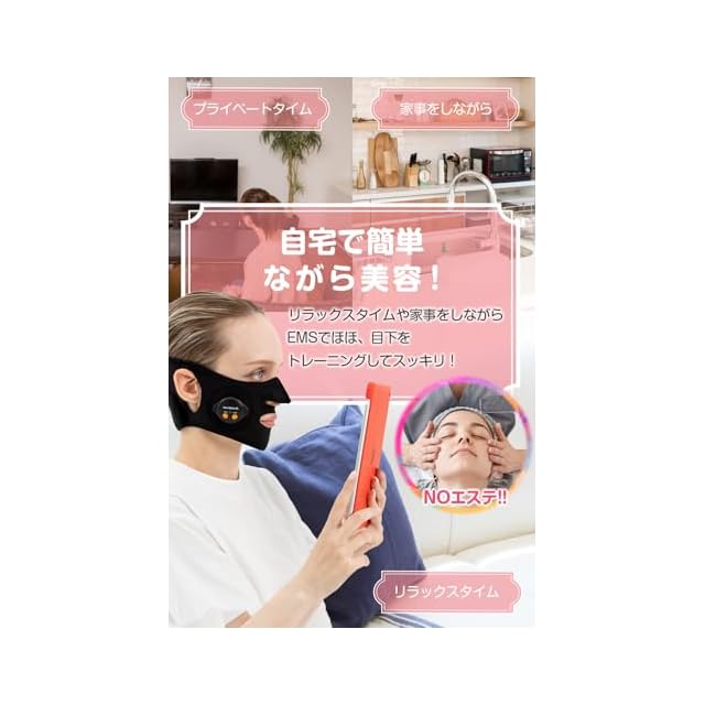 【フェイスベルトデザイン変更 PLEASINGSAN emsフェイスベルト】フェイスベルトのデザインを変更して、簡単に装着できフィット感が良くなりました。両手がフリーなので、料理・家事・育児・読書 等のリラックスをしながら使用でき、表情筋をトレーニングして明るくキリっとした表情へ!