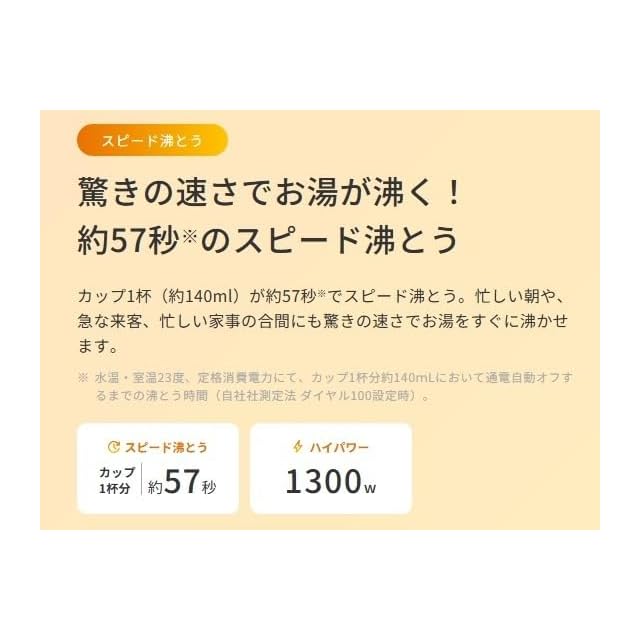 ※カップ1杯(約140ml)が約57秒※でスピード沸とう。忙しい朝や、急な来客、忙しい家事の合間にも驚きの速さでお湯をすぐに沸かせます。