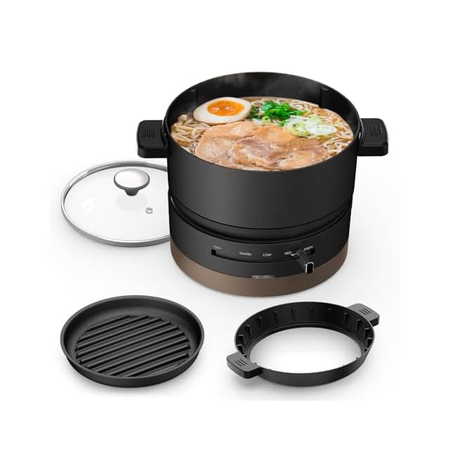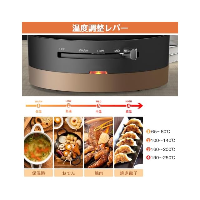 【温度調整機能】電気鍋は4段階の温度目盛「保温、低、中、高」、本体下部のレバーをスライドさせれば、65~250℃までスムーズに温度を調節可能です。メニューに合わせて温度を調整し、1人鍋は加熱ムラが出にくい、ラーメンとスープなどの料理がもっと美味しいです。(1L水沸騰までの目安時間:10~15分)