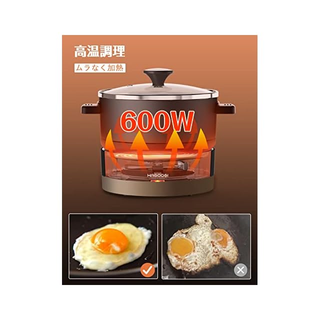 HAGOOGI (ハゴオギ) 電気鍋 グリル鍋 ひとり暮らし用 1L 600W 温度調整機能 着脱式 丸洗い可 一台多役 クッキングケトル 波形プレート 蓋 付き なべサイズ17cm ブラック