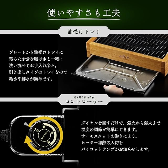 プレートから油受けトレイに落ちた余分な脂は水と一緒に洗い流せてお手入れ楽々。
