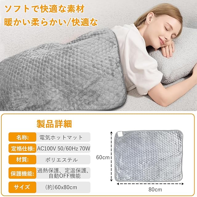 【2025 AIスマート恒温技術】JEEYING 電気ホットマット 一人用 ミニホットカーペット 電気毛布 3S速暖 6段階温度調節 5段階タイマー PSE認証済 過熱防止 省エネ 丸洗い可能 お尻/お腹/背中/肩/足/膝はホームオフィスで使用 防寒対策 日本語説明書付き(グレー,60×80cm)
