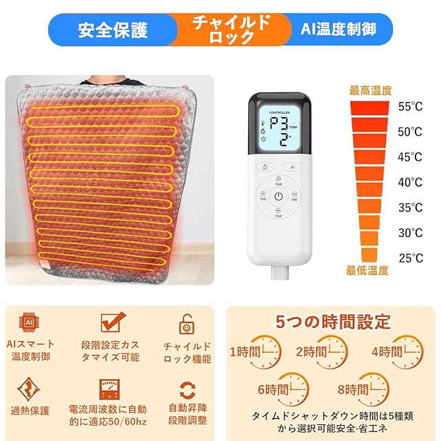 【タイマー機能・スマート調節】スマート電気パッドは5段階のタイマー機能(1h/2h/4h/6h/8h)を備えています。さらに、タイマーを設定しなくても、温度が60℃を超えた場合には自動的に電源が切れる保護機能を搭載しています、また、低温火傷を防止するため、本製品の高温設定ではスマート調節機能を搭載しています、高温6段階(50-55℃)の場合、17-13分加熱後に自動的に5段階に下がります。高温5段階(50-45℃)の場合は、23-20分加熱後に自動的に4段階(45-40℃)に下がります。高齢者や子供でも安心して使用できます。