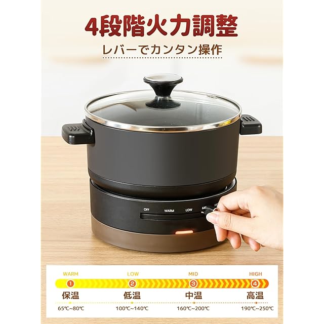 【レバーで4段階温度調節可能】レバーで温度調節できるので、誤って触れてしまう可能性が減り、保温・低温・中温・高温(0〜250°C)火力が選べるので用途に合わせて使い分けが可能。煮物やスープ、味噌汁などを作ったり、カレーやハヤシライスなども作ることができますが、朝食時に目玉焼きとベーコンを焼きます!