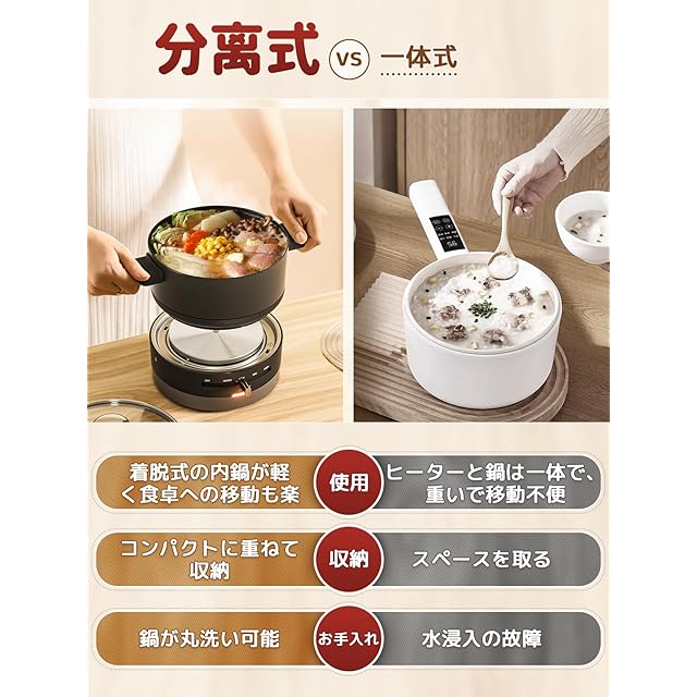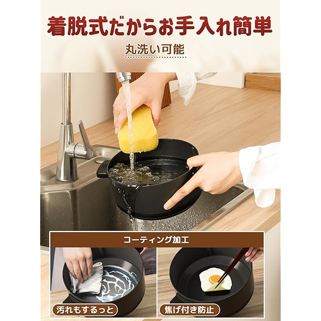 【お手入れカンタン】分離型デザインで、内鍋は取り外せて拭いたり洗ったりしやすく、後片付けの手間を軽減できます。鍋はフッ素加工で焦げ付きにくく、焦げ付きも防げるため、清潔な状態を保てます。 長いハンドルもないので、保管スペースを節約できます。