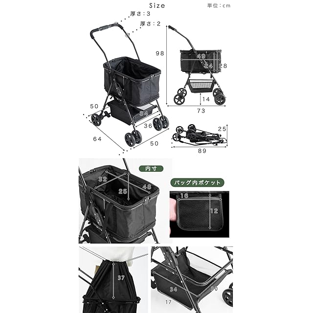 【サイズ】外寸:約幅50×奥行き73×高さ98cm (折りたたみ時) 約幅50×奥行き89×高さ25cm【重量】5.6kg (梱包重量:7kg)【耐荷重】本体:30kg (カート下収納部分:約5kg)