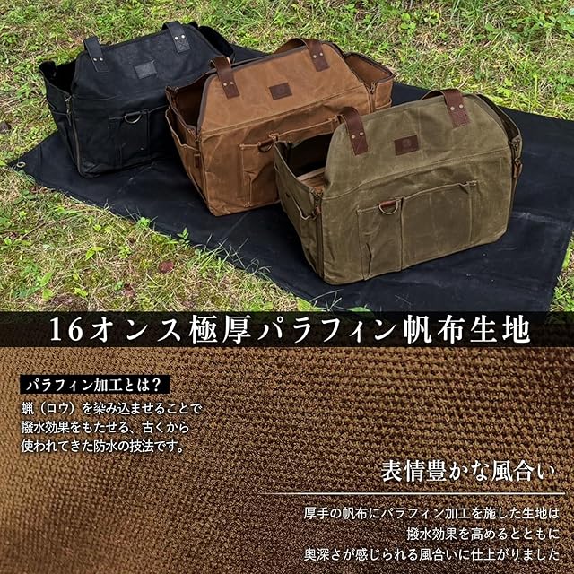 【深みのあるオリジナル生地】16ozの極厚パラフィン帆布生地を使用。パラフィン加工とは、蝋(ロウ)を染み込ませることで撥水効果をもたせる、古くから使われてきた防水の技法です。使い込むほどに白っぽい折り目のあとやシワ(チョークマーク)が刻まれるのが特徴です。製品特性をご理解の上、味わい深い風合いをお楽しみください。