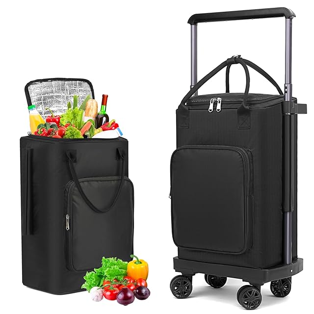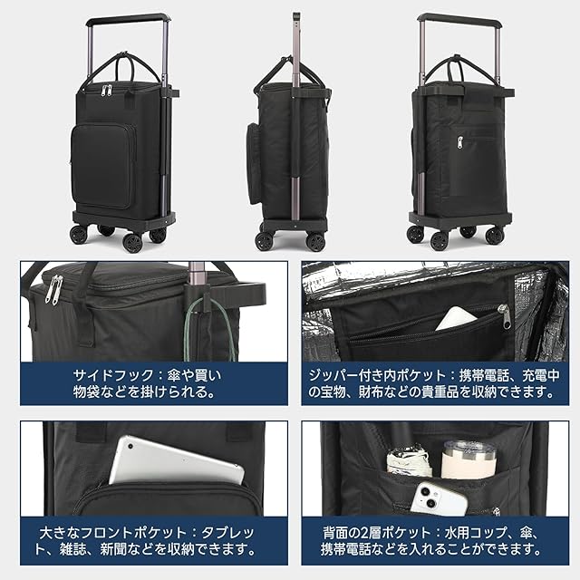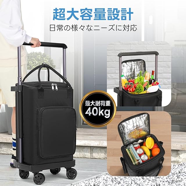 HeGeed【2025新登場】ショッピングカート 4輪 買い物カート 大容量 35L 保冷保温機能付き 2WAY 広タイバー360°回転自在キャスター3段階高さ調節可能 耐荷重40kg フック付き 高齢者向けショッピングカート 買い物かご 簡単組立 荷物運び、ピクニック、ショッピング、旅行などに便利、防災グッズ
