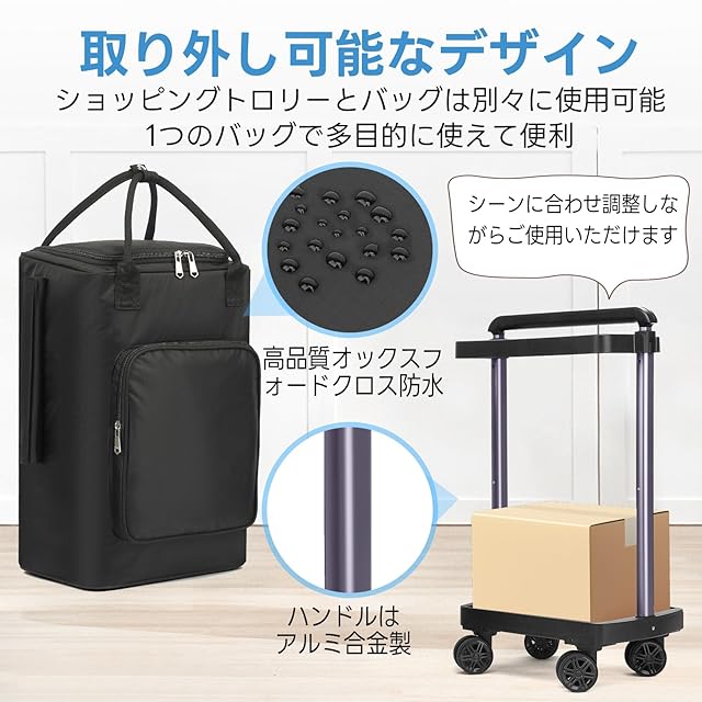 【高品質素材】バッグ内部全体に冷熱保温機能が付いています、ショッピングカートの表面素材は高品質のオックスフォード布+防水コーティングで、インナーライナーはアップグレード素材のEVAを使用し、厚手のライナーです、優れた防水効果があります。 雨、雪、の日でも中の商品が湿る心配はありません。バッグとトローリーを別々に使える2WAY仕様の使い方ができ、カートはカートとしても独立したハンドバッグとしても使えます。