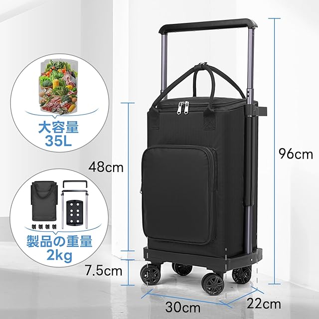 【商品詳細】サイズ:(約)高さ96cm (地面から数えて)×袋の高さ48cm×車輪の高さ7.5cm×袋の長さ30cm×板の幅22cm,材質:外側は上質なオックス、内側全体の内装はアルミホイル、ボディ、フレーム、キャスターの素材はPP、アルミ合金を使用。製品重量:2kg,最大耐荷重は40kg。