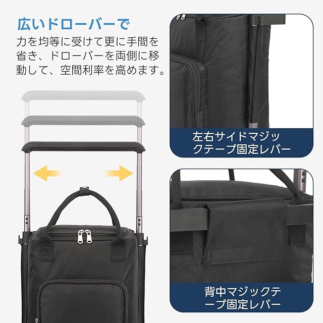 【最新のアップグレード設計】ショッピングカートは広いドローバーのデザインを採用し、揺れを大幅に減少し、使用中に更に安定します。広いドローバーのデザインは、ドローバーを両側に移動し、空間の利用率を効果的に向上させます。バッグとトローリーを別々に使える2WAY仕様の使い方ができ、カートはカートとしても独立したハンドバッグとしても使えます。