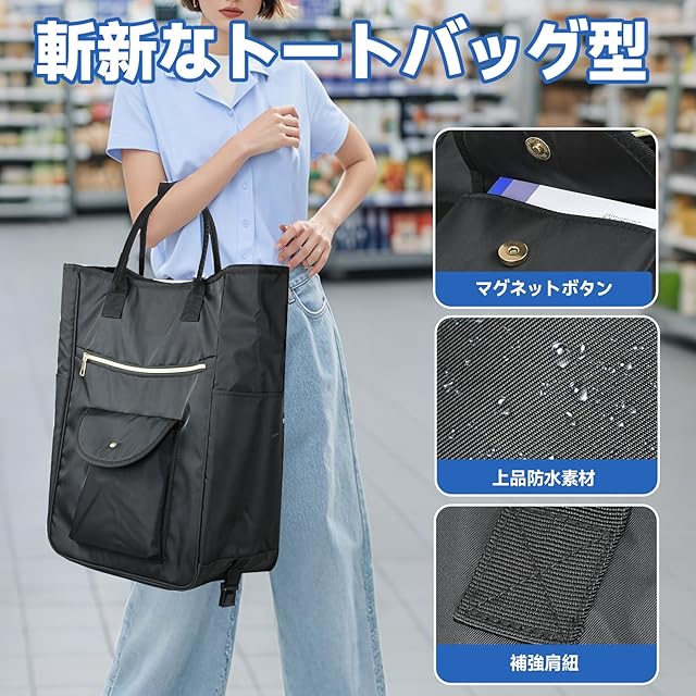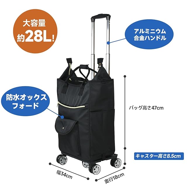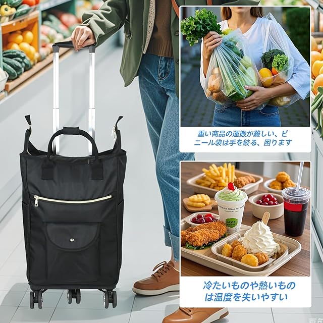 zmayastar 買い物カート 5輪 ショッピングカート 保冷機能付き トートバッグ型 お買い物キャリー キャスター付き 保冷バック 保温 買い物 折り畳み式 軽量 取り外し可能 2WAY 軽量 ハンドル長さ調節3段階 (ブラック, 28L)