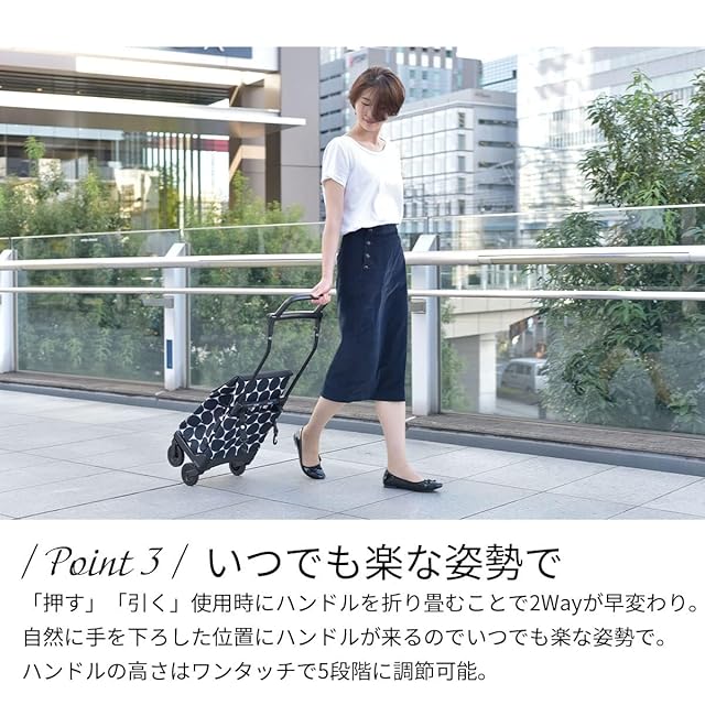 【いつものお買い物をもっと楽に】狭い道では「押す」、荷物が重いときは「引く」など路面の状況や、店内、公共交通機関など、様々なシーンに合わせて自分に合った楽な使用方法ができる2Wayタイプのショッピングカート。安定感のある4輪で、わずか2.4kgの軽量設計。「押す」「引く」使用時にハンドルを折り畳むことで2Wayが早変わり。自然に手を下ろした位置にハンドルが来るので、いつでも楽な姿勢でご使用いただけます。