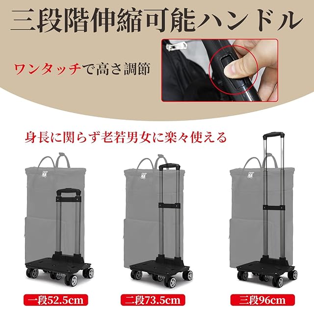 【ハンドルの高さは3段調節可能】滑り止めの快適なハンドル設計は、人間工学設計に適合し、手触りがより快適で、長時間握っても疲れない、ワンタッチでレバーの長さを調節でき、丈夫で便利である。ハンドルの長さは荷物の大きさや重さに合わせて調節でき、荷物を運ぶ負担を軽減します。