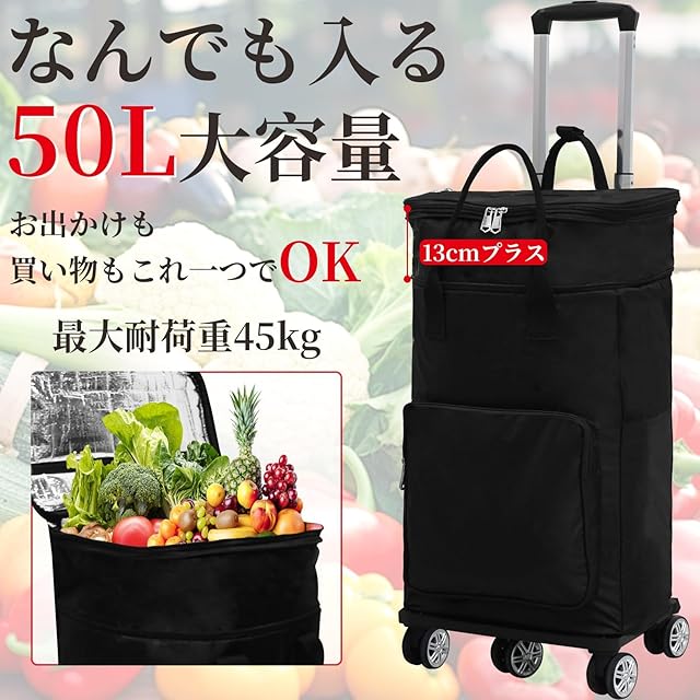 HeGeed ショッピングカート 5輪 買い物カート【拡張り13cm 】大容量 50L 保冷保温機能付き 2WAY 広タイバー360°回転自在キャスター3段階高さ調節可能 耐荷重45kg フック付き 高齢者向けショッピングカート 買い物かご 簡単組立 荷物運び、ピクニック、ショッピング、旅行などに便利、防災グッズ