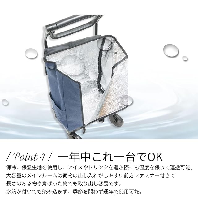 【一年中これ一台でOK】保冷、保温生地を使用しているので、アイスやドリンクを運ぶ際にも温度を保って運搬可能。水滴が付いても染み込まない生地を採用し、季節を問わず通年で快適にご使用いただけます。