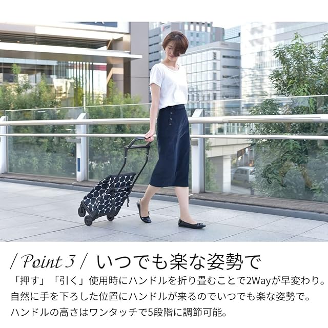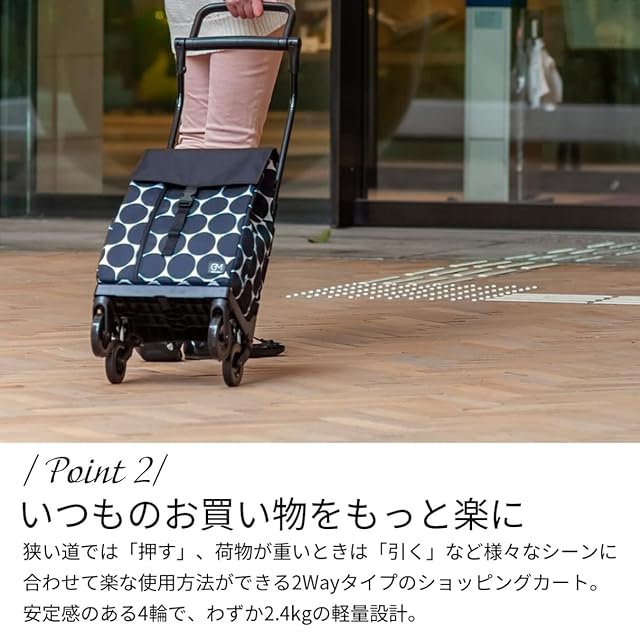 【いつものお買い物をもっと楽に】狭い道では「押す」、荷物が重いときは「引く」など路面の状況や、店内、公共交通機関など、様々なシーンに合わせて自分に合った楽な使用方法ができる2Wayタイプのショッピングカート。安定感のある4輪で、わずか2.4kgの軽量設計。「押す」「引く」使用時にハンドルを折り畳むことで2Wayが早変わり。自然に手を下ろした位置にハンドルが来るので、いつでも楽な姿勢でご使用いただけます。