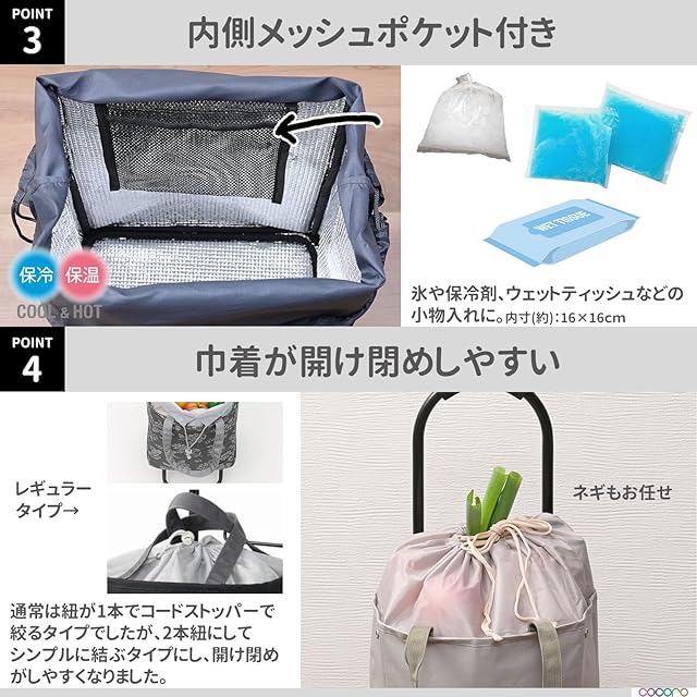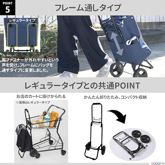 【レギュラータイプの便利機能はそのまま】■お店のカートに掛けられる:カートの置き場所に困りません。■保冷保温機能付き:冷凍食品の持ち運びにオススメです。■大きめタイヤ:タイヤが大きいので安定感があり、走行中のガタつきを軽減します。■手が痛くなりにくい取っ手:持ち手にはクッションが付いているので、手にかかる負担を軽減できます。■かんたん取り外し:バッグ下の面ファスナーを外し、カートからバッグを引き抜けば、カンタンにバッグをカートから取り外すことができます。■コンパクト収納:フレームは簡単に・コンパクトに折りたためるので、持ち運ぶ際邪魔になりません■バッグのみで使える:サイドのスナップボタンを使えばスッキリした印象でお使いいただけます。■カートのみでも使える:飲み物の箱買いやクーラーボックスの運搬など、重たい物を運ぶ際に便利です※別途キャリーバンドをお買い求め下さい。