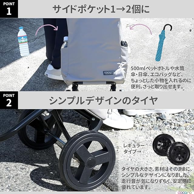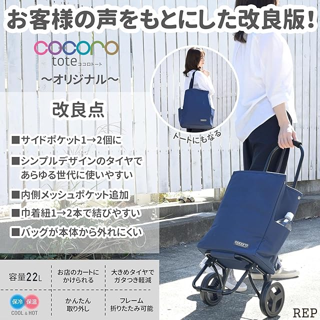 【お客様の声を元に改良したオリジナル商品】御好評をいただいているレップのショッピングキャリーCOCORO(ココロ)トートタイプから、オリジナル商品が登場!改良ポイント■1:外ポケットを1つから2つに増やし、飲み物や傘などを一緒に持ち歩けるようにしました。■2:バッグの巾着紐を1本から2本にしたことで、力が弱い方でも、よりラクに開け閉めできるようになりました。■3:内側にメッシュポケットを付けたので、保冷剤を入れたり、小物を入れられるようになりました。■4:タイヤのデザインをシンプルにすることで、より幅広い年齢の方にお使いいただけるようになりました。■5:バッグ背面の面ファスナーでフレームに固定していましたが、バッグをフレームに通す仕様にしたことで、使用中にバッグがフレームから外れないようになりました。