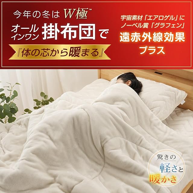 【一枚2役 多機能ラグジュアリー冬用毛布掛け布団】ノーベル賞を受賞した奇跡の素材『グラフェン』とNASA宇宙服素材『エアロゲル』、この二つの最先端テクノロジー素材をメインに、高機能抗菌防臭中わたなど機能が異なる4種のハイテク中わたを採用した毛布 掛け布団です。側生地には、伝統的な高級毛布に使われているニューマイヤ生地を採用し、魔法瓶効果によって外からの冷気をシャットアウトし、体温を反射して温かさを保つアルミ蒸着加工を施した特殊中材で挟んだ、6層構造の冬用厚手毛布です。一般的毛布よりも大きめサイズで、四隅に布団カバー用のループが付いており、冬用掛け布団としてもお使いいただけます。軽量でありながら、宇宙クラスの暖かさを実現しています。