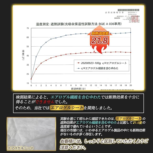 【消音断熱アルミシート】お客様の使用感を向上させるため、アルミをコーティングした柔らかい生地を新たに開発しました。アルミシートが熱を断ち切り、熱を蓄える特性と同時に、音するの問題も解決しました。反射熱も抜群で、さらにエアロゲルと合わせて使うとダブル断熱できました。