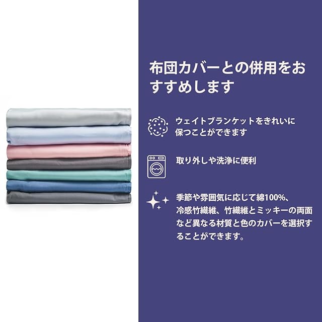 【天然素材表地】100%コットン。天然素材を採用しており、心地のよい肌触りが楽しめます。ブランケットの中に充填しているガラスビーズは安全な無毒無臭ビーズであり、ハグされている感覚を再現してくれます。加重毛布は自宅の洗濯機で洗えます。しかし、あまり何度も洗わないほうが、使用寿命が短くなります。専用加重毛布カバーを一緒に買って、カバーを洗濯すればいいのです。