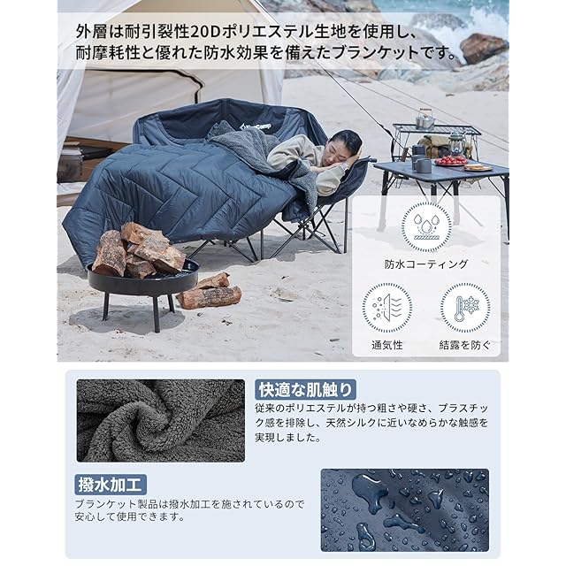 肌触り&防風防水の両立:ブランケットは表地が20Dポリエステルで軽量で防風、撥水加工が施され、野外での使用も安心です。裏地のフリースは厚手で暖かく、なめらかな手触り、肌に直接触れても快適です。