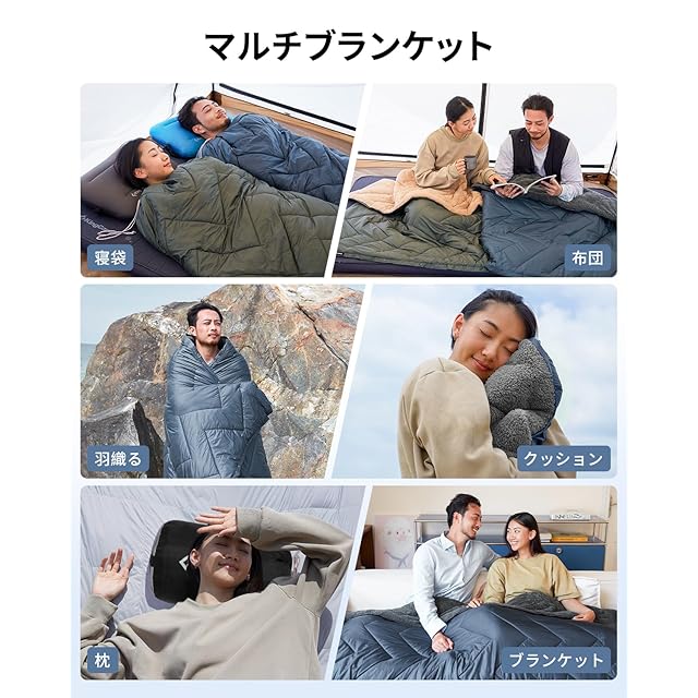 多シーン活用:1枚で多機能を実現。春・秋は単体使用、冬は寝袋と重ねて保温性アップ。キャンプ、車中泊、アウトド、アピクニック、自宅ソファなど幅広く活用可能。
