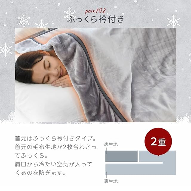 ふんわりしっとり滑らかな肌触り♪毛布生地を2枚合わせて縫製する「2枚合わせ毛布」なので、1枚ものの毛布と比べて2枚の生地の間に空気の層ができ、抜群の保温力を発揮します!重たい毛布より少し軽めの掛け心地が好きな方におすすめのほどよいボリューム感。衿付きで首元までふっくら。外から冷たい空気が入るのを防ぎ、温まった空気を逃がしません。