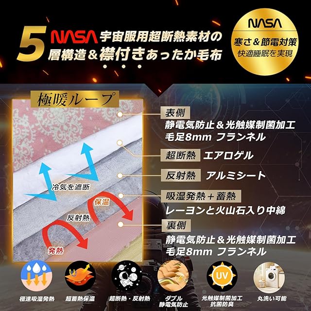 【極暖ループ設計:5層構造&襟付き】この毛布は5層構造のデザインです。①層目:高密度の<静電気防止・光触媒制菌加工>フランネル表地、②層目:NASAの宇宙服にも使用される<超断熱>エアロゲルシート、③層目:柔らかい<防音・断熱>アルミシート、④層目:<超吸湿発熱>レーヨン&HEATSTARsolar<蓄熱保温>中綿、⑤層目:高密度で静電気防止と光触媒制菌加工のフランネル裏地です。この5層でしっかり保温のループを生成し、さらに、冬用毛布は襟付き仕様で、首と肩の接触部分に柔らかくて二重構造の衿を付けて、冷気の侵入を防ぎ、さすがに上品な暖かくふわふわ安眠ブランケットです。
