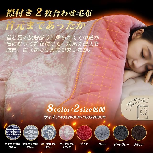 【安心の品質:抗菌防臭&洗濯可能】毛布の表裏生地は光触媒制菌加工を施して、優れた抗菌防臭効果を実現しました。汗をかいてもニオイにくく、細菌の増殖を抑制し、心地よい使用感を維持することができます。ご家庭で気軽に洗濯できます。速乾性に優れているので、洗ってもすぐに乾き、いつでも清潔にお使いいただけます。【品質】当店は日本の会社です。製品は日本国内で企画を行い、国際基準ISO9001認定を持つ中国工場で生産します、安心的な品質ができます。過剰包装を防ぎ環境を保護するため、製品は半圧縮包装されています。開封後は商品を広げて置いたり洗ったりすると、製品の折り目やふんわり感が元に戻ります。万が一商品に不具合場合あれば、1年間のをお付けしておりますので、お気軽に当店までご連絡ください。品質と対応は第一だと信じていますので、何卒よろしくお願いいたします。