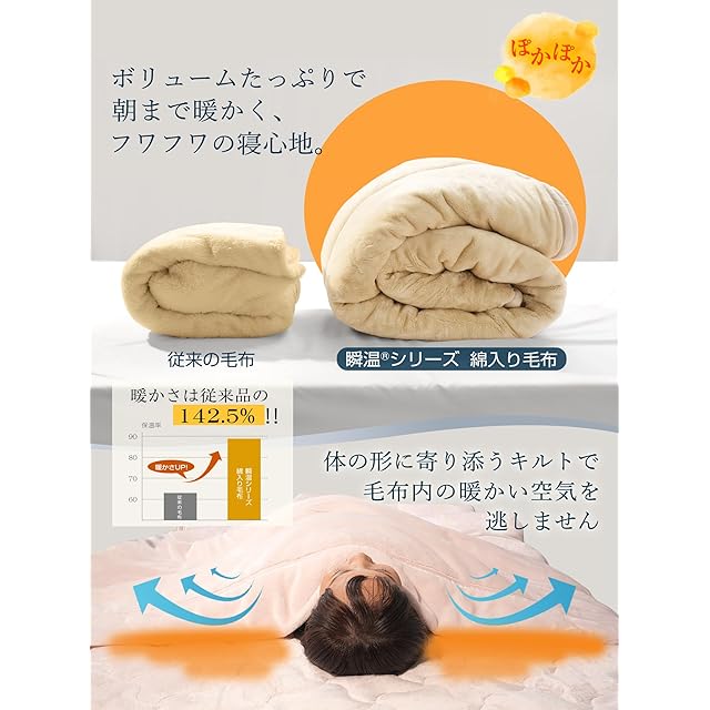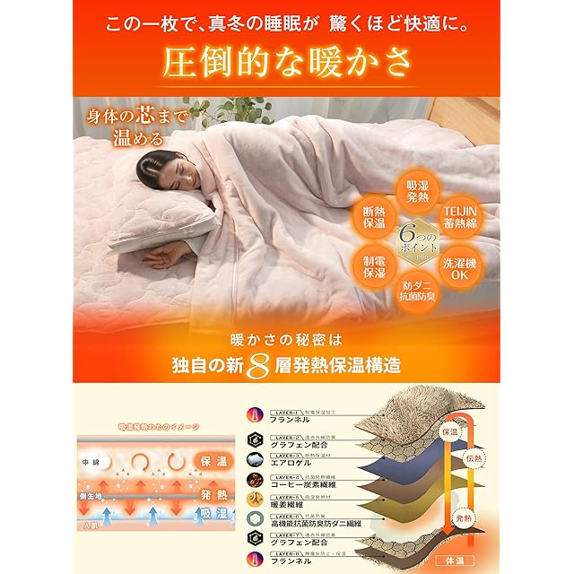 【一晩中持続する暖かさの秘密】は、研究に研究を重ね、こだわりぬいた独自の「新8層発熱保温断熱構造」です。①この瞬温シリーズ冬用あったか毛布の表層には、驚くほどなめらかな肌触りのマイクロファイバーを使用、ふわっと素肌に触れるたびに、極上の気持ちよさにとろけてしまうほど。②生地基布に「遠赤外発熱」「熱伝導性」「蓄熱保温」「抗菌防臭」特性を備えている奇跡のグラフェン素材配合しています。③『贅沢に詰め込んだのは、特別な中わた』の上層には、宇宙服に採用されている次世代断熱材『エアロゲル』層×「吸湿発熱」「蓄熱保温」「遠赤外発熱」「永久消臭」の特性を持ち、環境にもやさしい素材『コーヒー炭素繊維』を採用、中わたの下層には天然ショウガ成分配合の吸湿発熱新素材『暖姜繊維』と高機能抗菌防臭防ダニ繊維を採用しています。④「吸湿発熱」×「遠赤外線発熱」のわたが、寝ている間の汗を吸って暖かさに変え、しかもムレにくくなっているので、より保温性が高くなっています。圧倒的な暖かさを効率よく毛布全体に伝えて循環させるから、寒い冬でもあたたかさが保てます。