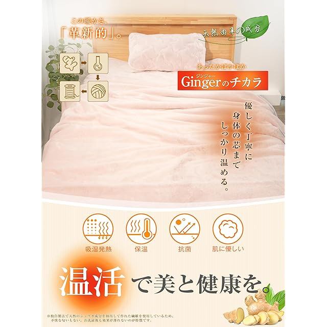 【極みジンジャーのチカラ&『温活』で美と健康を】体温が1℃下がると免疫力は約30%減弱すると言われます。「冷えは万病の元」と言われるように、体を温めることが大切です。『温活』とは、基礎体温を上げて体の不調を改善し、身体の調子を整える習慣のこと。天然由来のショウガ成分配合の『暖姜繊維』が天然の「吸湿発熱」「蓄熱保温」「天然抗菌」3つの特徴を持ち、体にも環境にもやさしい。当店新品の極上あったか毛布は、『温活』おすすめの極み生姜のちからで優しく丁寧に体の芯まで温めます。一晩中持続するあったかぽかぽか。この瞬温シリーズ綿入りあったか毛布一枚で、お家でもオフィスでも気軽に『温活』。※独自製法で天然のショウガ成分を抽出して作れた繊維を使用しているため、不快な匂いもないし、お洗濯後も効果が薄れないのが特徴です。