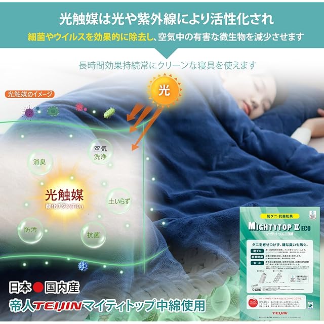 【ダブル抗菌防臭】この毛布には、帝人の「マイティトップⅡECO」抗菌防臭・防ダニ中わたを使って、光触媒加工が施されており、細菌やウイルスの除去、臭い分子の分解を通じて、清潔で快適な環境を保ちます。高い忌避効果でダニの繁殖も防ぎ、小さなお子様にも安心してご利用いただけます。