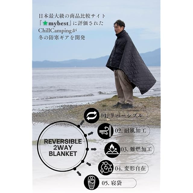 Chill Camping(チルキャンピング) キャンプ用 ブランケット 防寒 アウトドア キャンプ リバーシブル 難燃 エコダウン 車中泊 キャンプ 防災 旅行 コンパクト (ブラック 黒, Lサイズ)