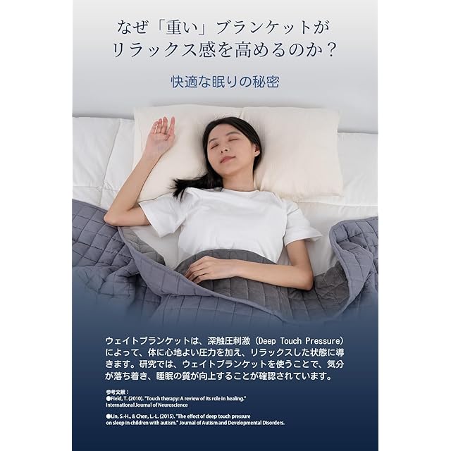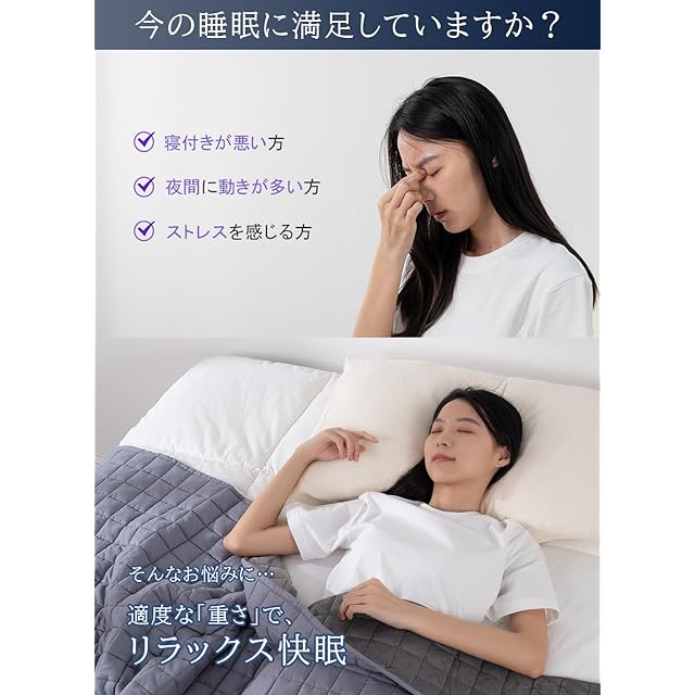 【深いリラックス効果を実感】身体全体を優しく包み込む重さで、心地よいリラックス感を提供します。Marine Moonのウェイトブランケット特有の均等な重さが、体のこわばりをやわらげ、深い眠りへと導いてくれます。
