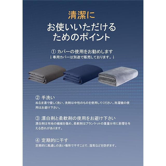 【清潔を保つために】ウェイトブランケットを清潔に保つために、ブランケットカバーの使用をおすすめします。カバーは別売りで、簡単に取り外して洗うことができます。これにより、ブランケットを長く清潔に保つことができ、快適に使用し続けられます。
