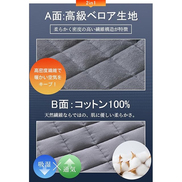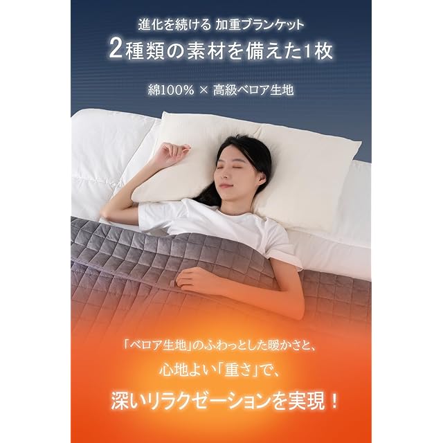 【両面素材で、季節ごとの快適さ】通常の重い布団や毛布とは異なり、両面に異なる素材を使用しています。A面は滑らかなベロア生地で、肌触りが柔らかく温かいので、寒い季節にぴったり。B面は通気性の良い100%コットン素材を採用し、蒸し暑い季節にも快適にお使いいただけます。これにより、1年を通して、どんな季節でも快適にご使用いただける加重ブランケットです。