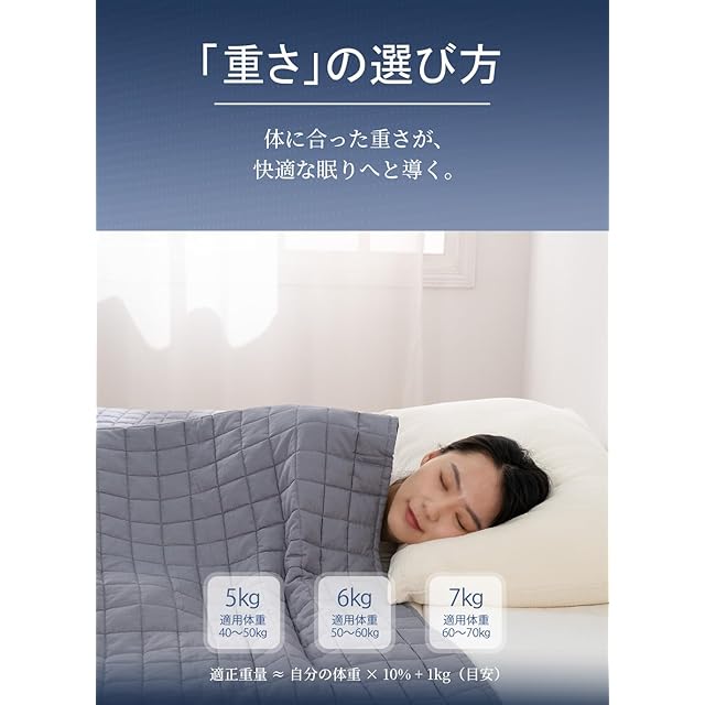【体重に合わせて選べる重さ】40~50kgの方には5kg、50~60kgの方には6kg、60~70kgの方には7kgがおすすめです。体重に合った重さを選ぶことで、快適な使用感をお楽しみいただけます。