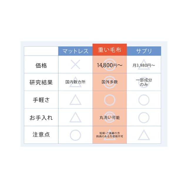 【少し重めな設計とサイズ】女性用Sサイズは122cm×198cmで6..8Kg、男性用Mサイズは152cm×203cmで9.0Kgと一般的なウェイトブランケット(加重ブランケット)より+2Kgほど重めな設計となっております。開発段階で様々な論文を検証した結果、この重さでの研究されていたことが多くさらに睡眠環境を整えるのに最適な重さということが判明したためです。他のウェイトブランケットでは物足りないという方にもオススメです。