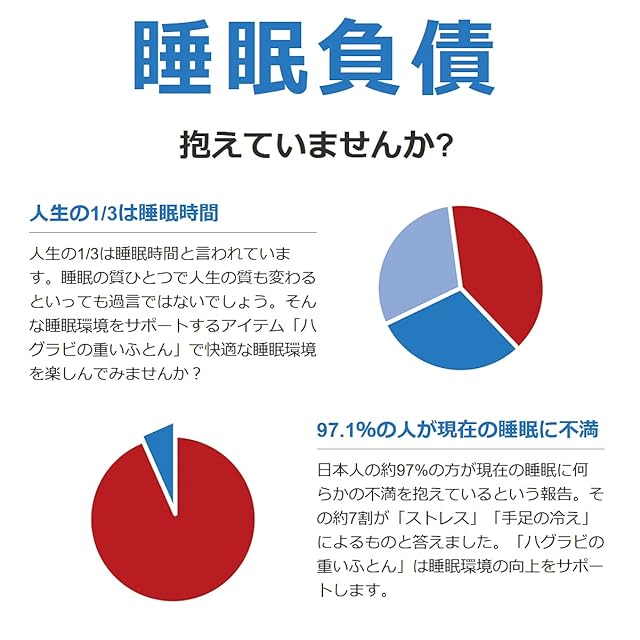 【睡眠投資していますか?】人生の約1/3は睡眠時間と言われています。快適な睡眠環境を整えることは、正に人生を整えることといっても良いのではないでしょうか。ハグラビのウェイトブランケット(加重ブランケット)は毎日気持ちの良い睡眠環境をご提供します。