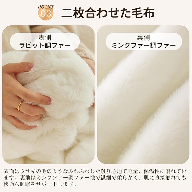 【高級素材毛布】ラビットファーを模したふわとろなファイバーを採用し、肌触りが抜群にやさしいです。通常の素材よりもさらになめらかで、就寝時により優しいタッチを提供するので、より速やかな入眠へと導くことができます。さらに、ATOPEN毛布に使用されている素材は一般的なファーケットよりも高いので、肌触りがよりソフトで滑らか、粗い摩擦感がほどんとありません。