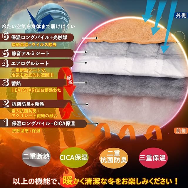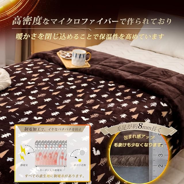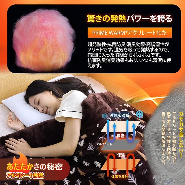 【真冬に絶対】電気代が上昇する今、暖かさ抜群の毛布は冬の快適な必需品です。弊社のこの毛布布団は、アルミシートとエアロゲルシートを使い二重の断熱性に加え、蓄熱綿と吸湿発熱綿を組み合わせた二重の保温性を持っています。また、中綿には日本の有名な帝人の抗菌防臭繊維が含まれ、さらに表面生地には光触媒加工を施したフランネルを使用しており、温感フランネルを使用し、乾燥肌を防ぎながら、肌の修復をサポートし、静電気も抑えるよう工夫しています。